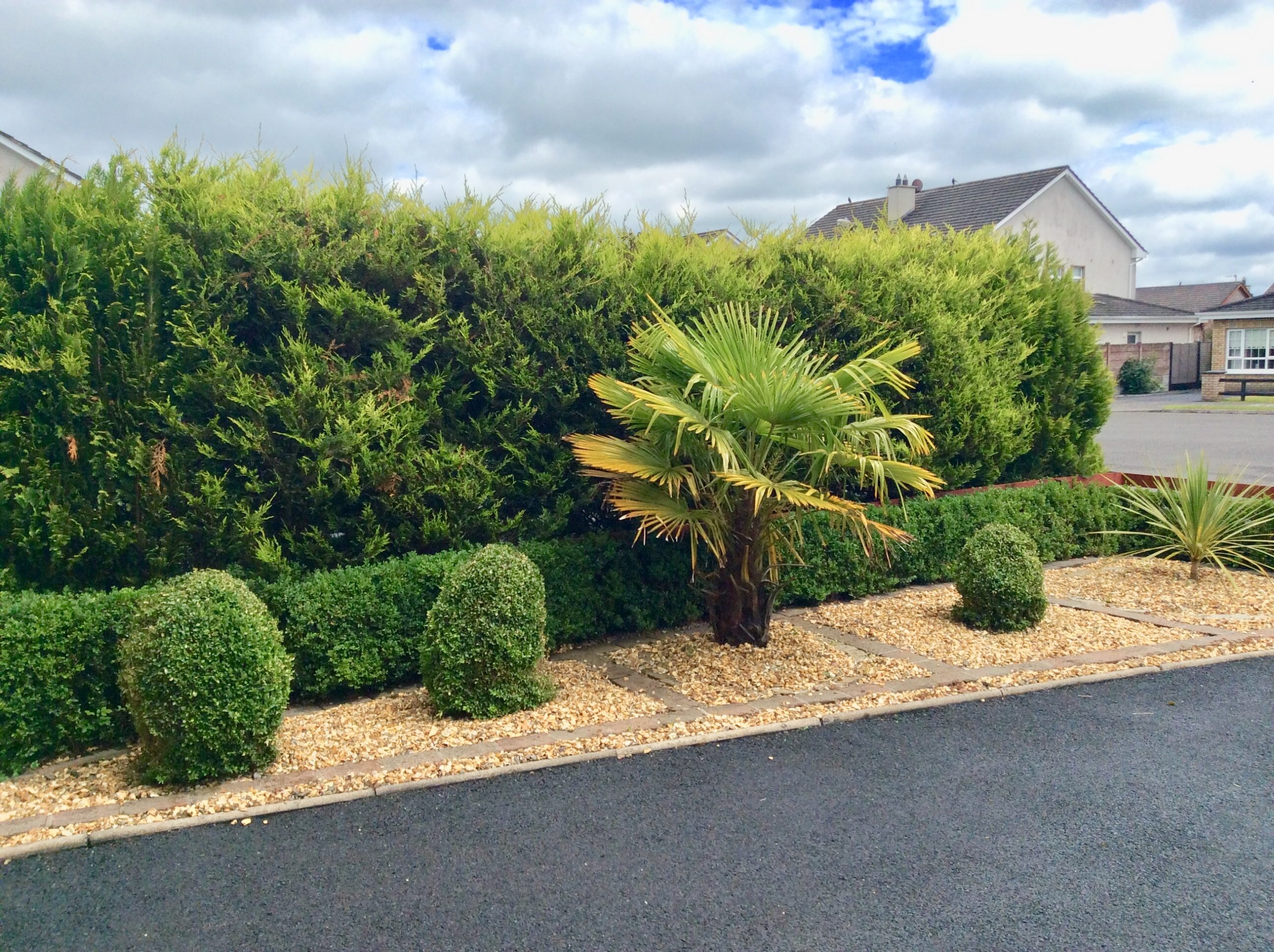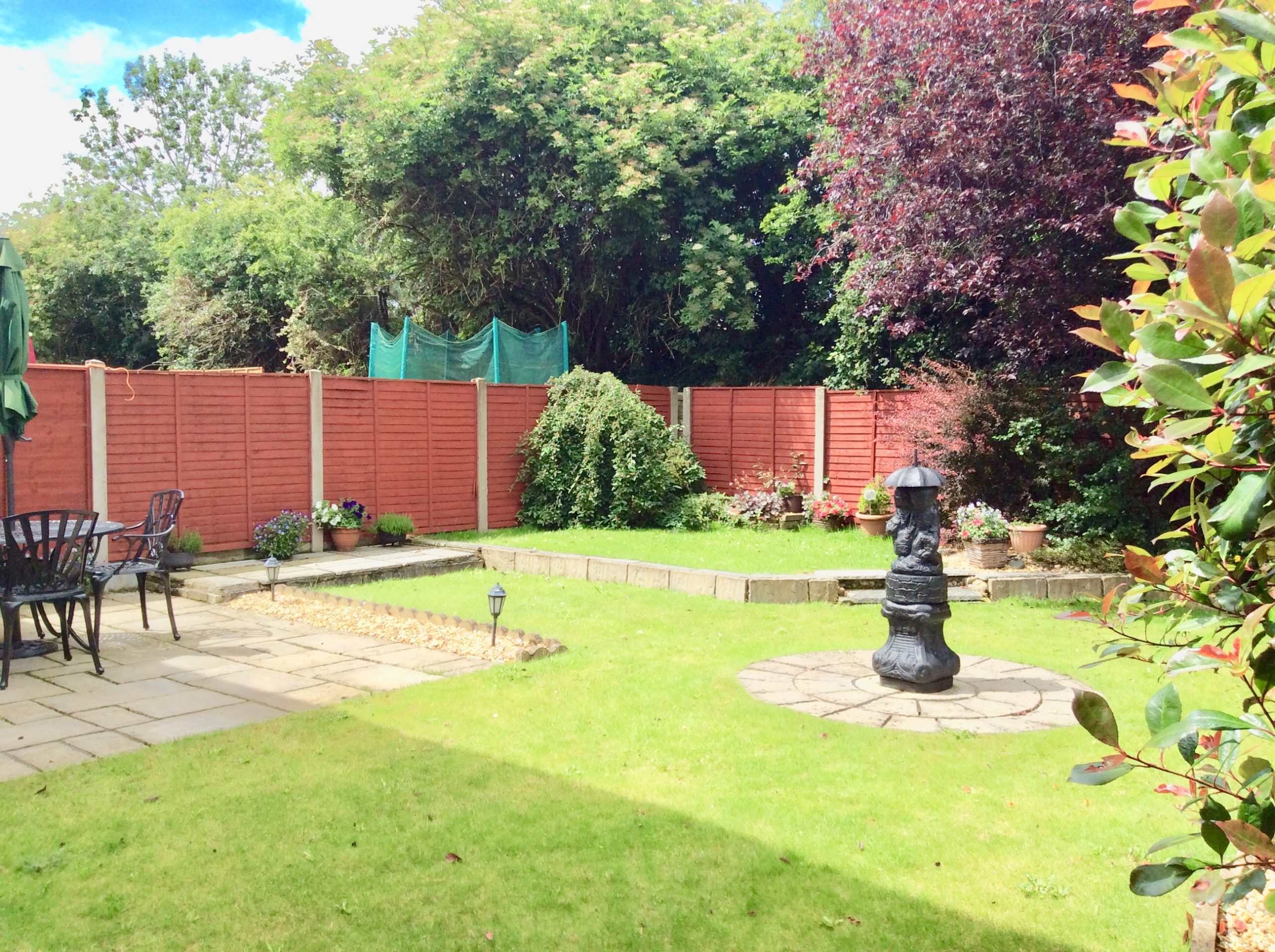 Rear Garden. Super bright back garden with mature boundary trees and shrubs. The oil tank has been cleverly disguised by a row of bamboo. Gravel path, evening sun and very private.