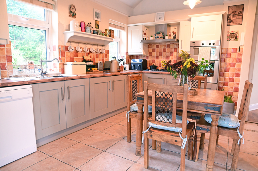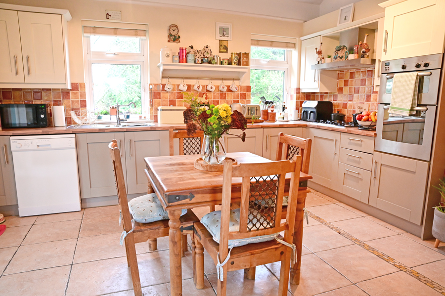 Maple shaker style kitchen units with tiled floor, integrated dishwasher, electric cooker and gas hob. Access to conservatory & utility room.