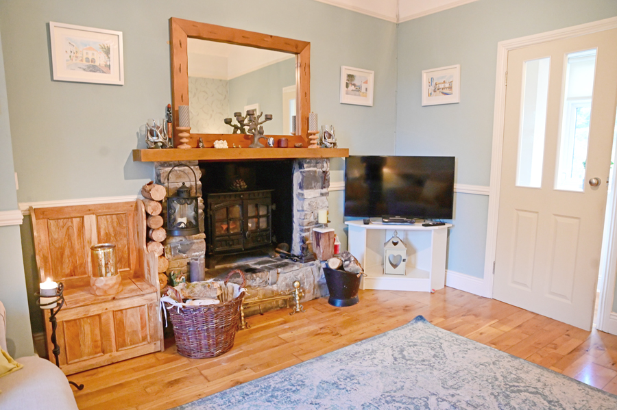 Semi solid floor, Natural stone fireplace with stove inset, dado rail, high ceiling, TV point.