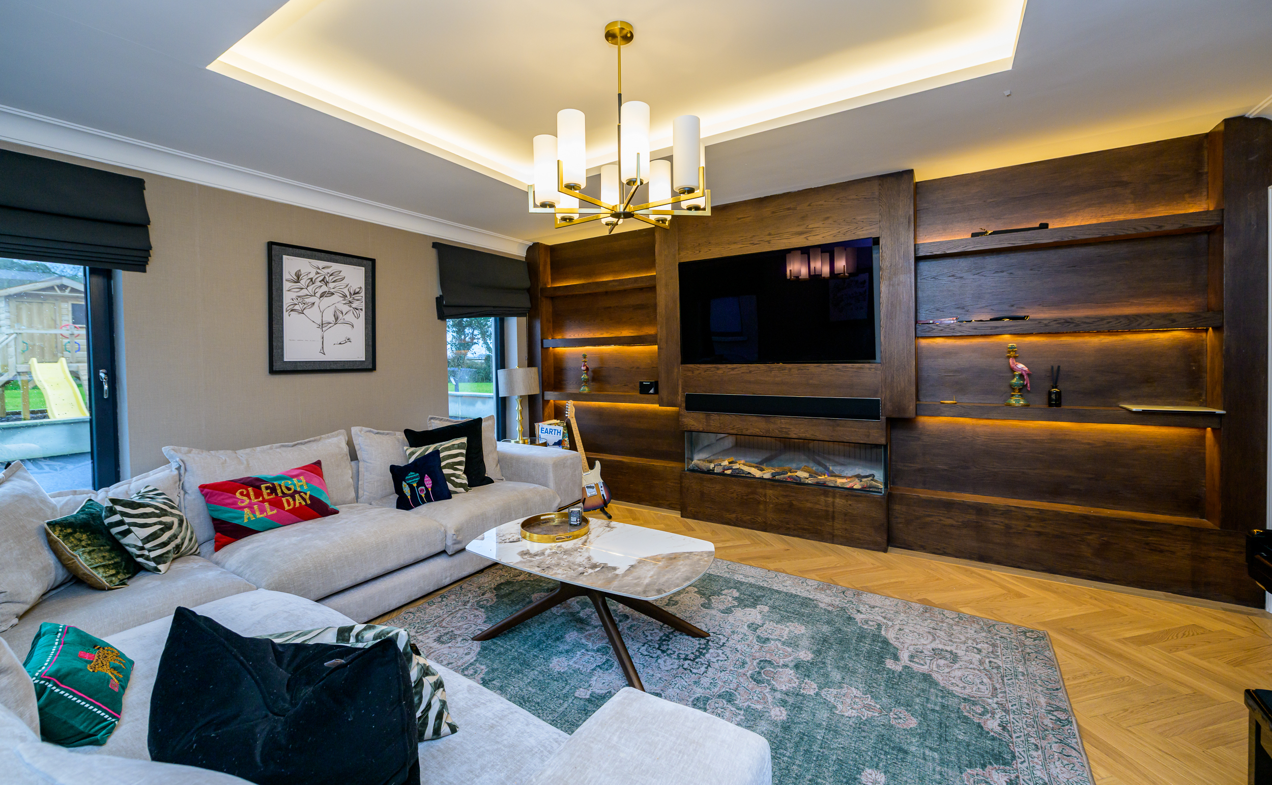 The sitting room exudes elegance and comfort, featuring a striking gas fireplace as the focal point of the room. The space has wooden floors, enhancing the cosy atmosphere, while the feature ceilings add a touch of grandeur. Creating a bright perfect space for relaxation and entertaining.
