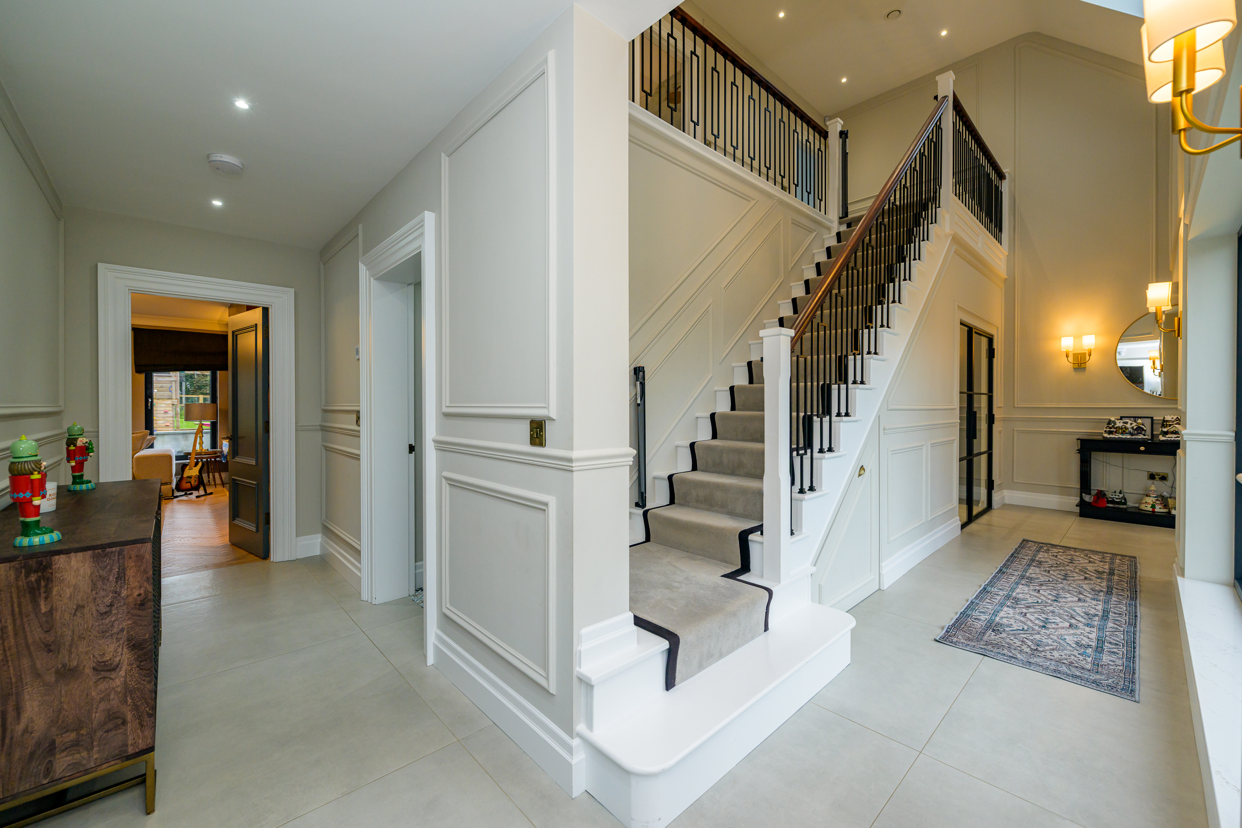 The entrance hallway is warm and inviting, featuring a bespoke staircase, a tiled floor and a convenient storage cupboard, providing practicality without compromising on style. Classic wood panelling and elegant feature centre and wall lights add a touch of sophistication to the space, creating a welcoming ambiance.