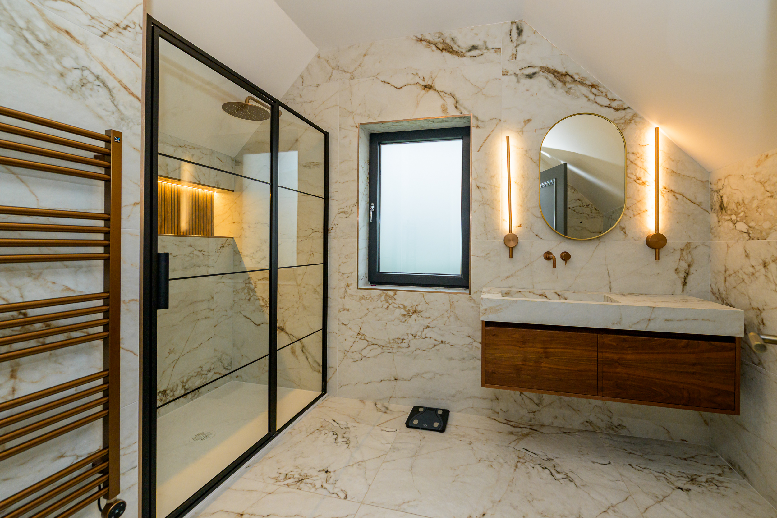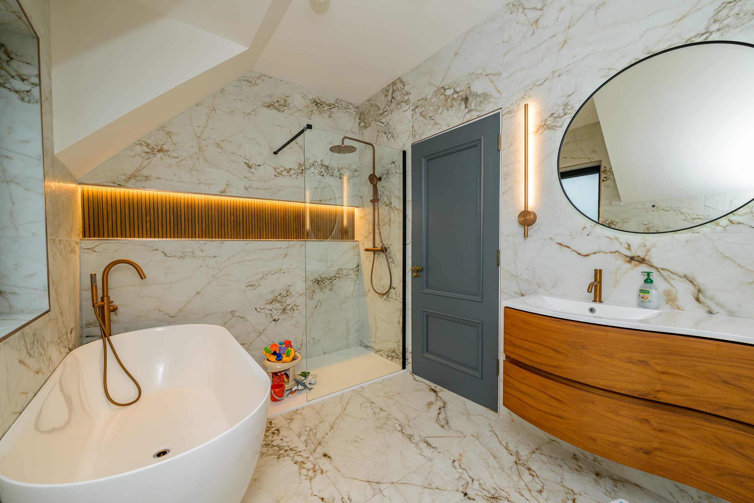 CKB Design bathrooms with Japanese smart toilet. The tiled floor adds a touch of refinement, creating a seamless and hygienic environment. The focal point of the room is the bath, offering a sense of grandeur and providing a perfect retreat for relaxation and indulgence.
