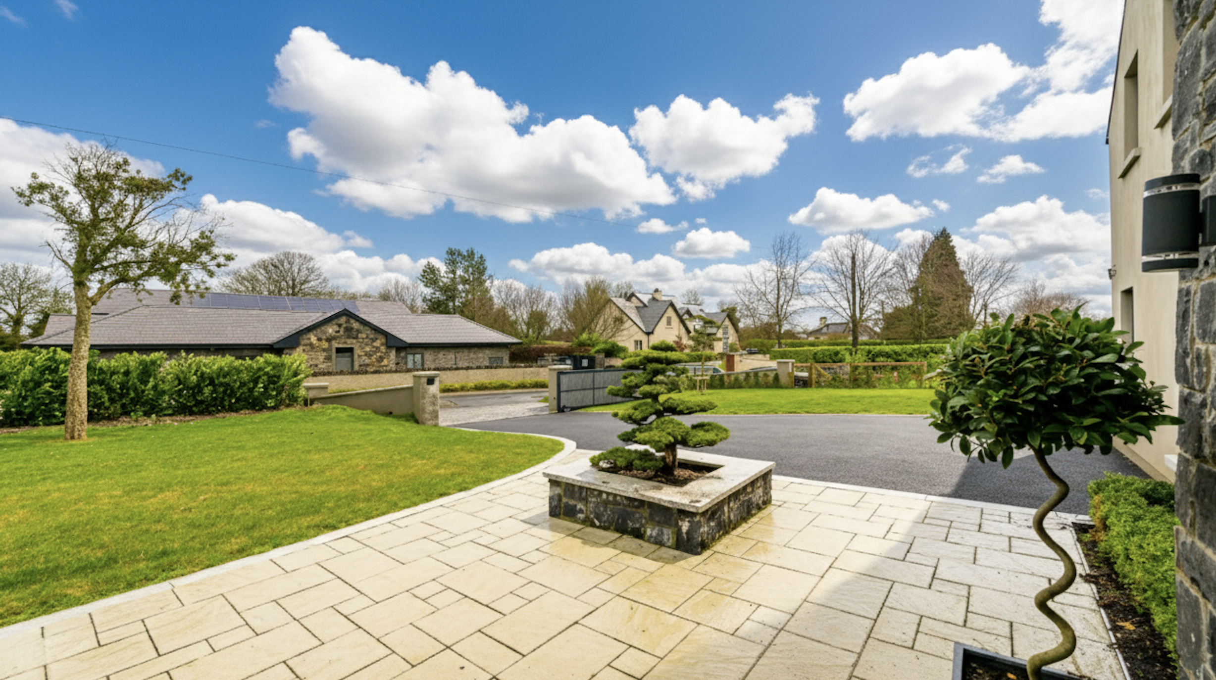 The front garden presents a picturesque scene with a lush lawn adorned by a scattering of majestic mature trees, creating a serene and inviting atmosphere. Adjacent to the front garden. Additionally, the property features a spacious decking area to the side, providing an ideal space for outdoor relaxation and entertainment.