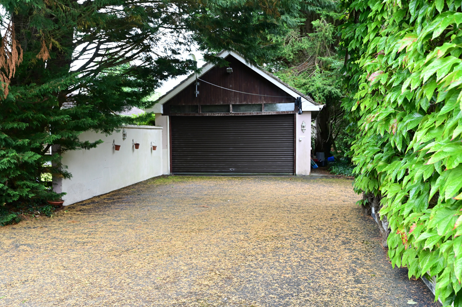 Detached Double Garage, Front and side entrances. Shelved storage.